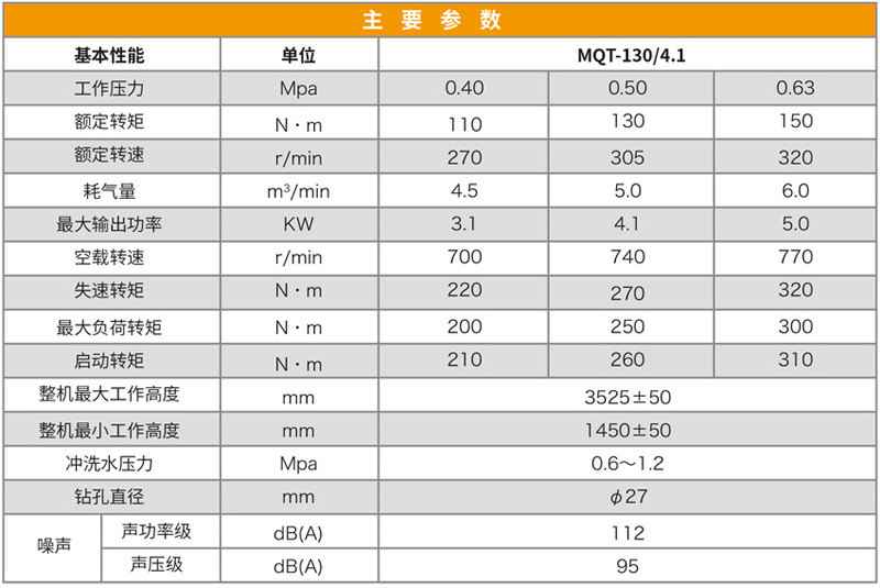 MQT- 130/4.1型氣動錨桿鉆機廣泛適用于巖石硬度≤f10的巷道,特別適應(yīng)煤巷的錨桿支護作業(yè),既可鉆頂板錨桿孔,又可鉆錨索孔,還可攪拌和安裝樹脂藥卷類錨桿、錨索,無需其他設(shè)備,既可實現(xiàn)錨桿螺母一次性安裝擰緊,達到初錨預(yù)緊力要求。