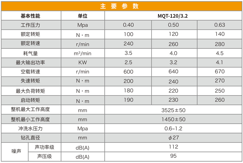 MQT-120/3.2型氣動(dòng)錨桿鉆機(jī)廣泛適用于巖石硬度≤f8的巷道,特別適應(yīng)煤巷的錨桿支護(hù)作業(yè),既可鉆頂板錨桿孔,又可鉆錨索孔,還可攪拌和安裝樹脂藥卷類錨桿、錨索,無需其他設(shè)備,既可實(shí)現(xiàn)錨桿螺母一次性安裝擰緊,達(dá)到初錨預(yù)緊力要求。
